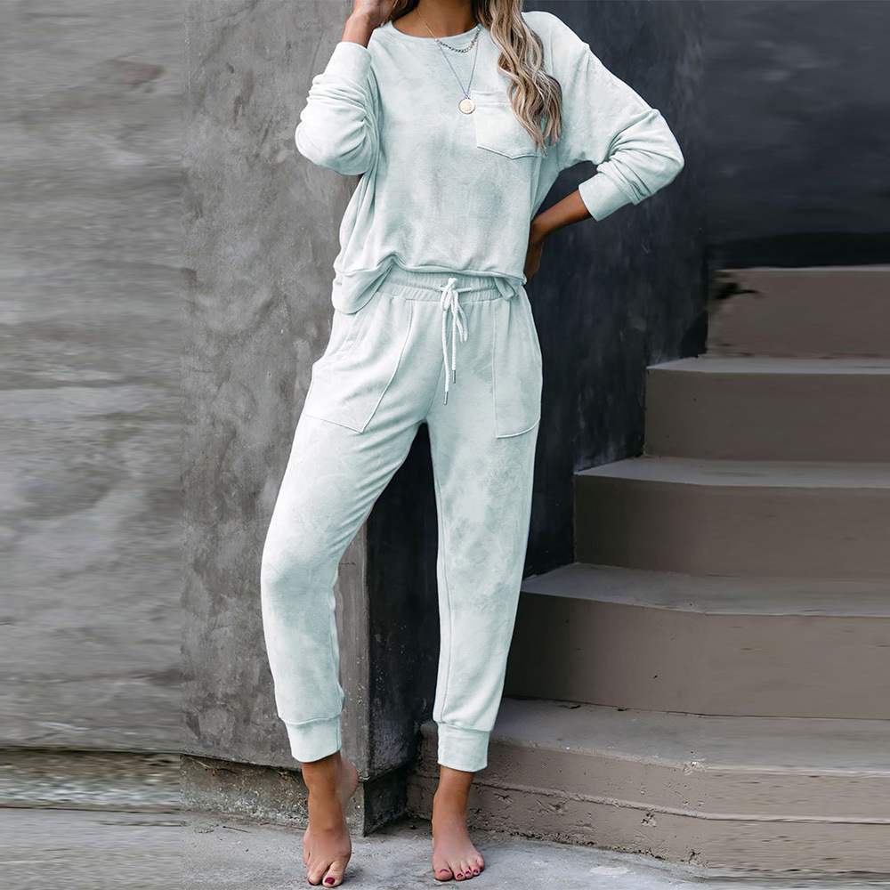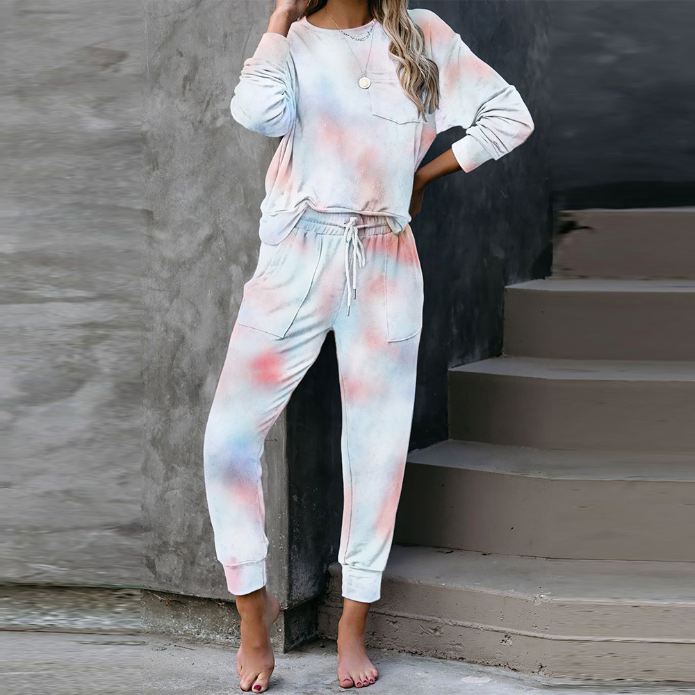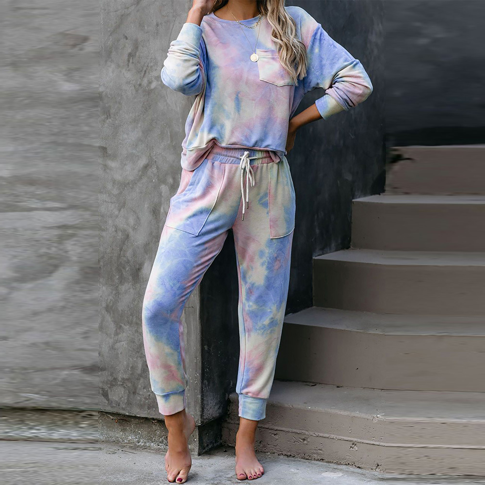 This stylish two-piece set includes a long-sleeved top and matching pants, designed to provide you with both comfort and fashion in mind. The vibrant tie-dye patterns add a touch of uniqueness to your home wardrobe, allowing you to express your personality even in casual settings.
