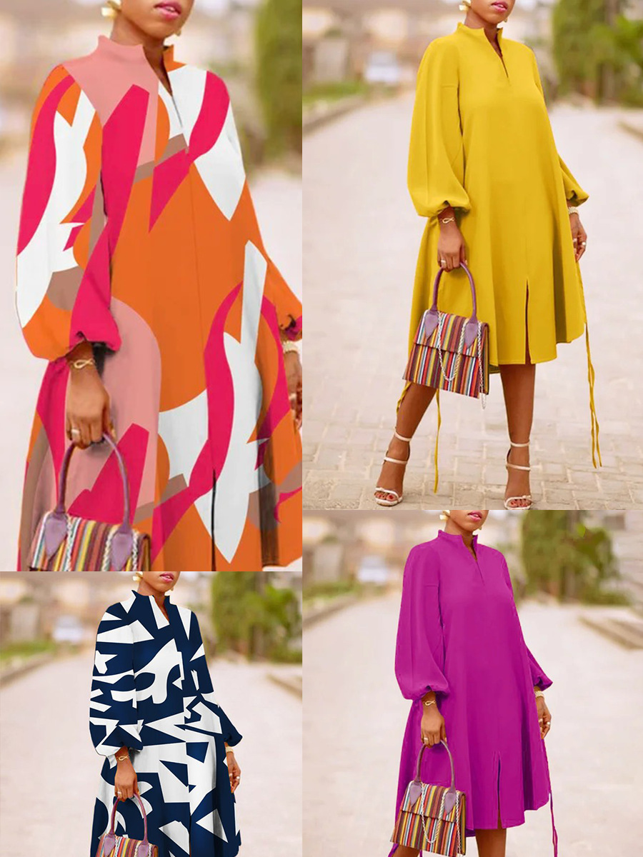 Featuring a V-neck design and beautiful lantern sleeves, this dress is not only stylish but also incredibly comfortable. The versatile color options, including Blue Printing, Color Printing, Purple, and Yellow, allow you to express your unique style. Whether you're dressing up for a special occasion or enjoying a casual outing, this dress is your go-to choice.